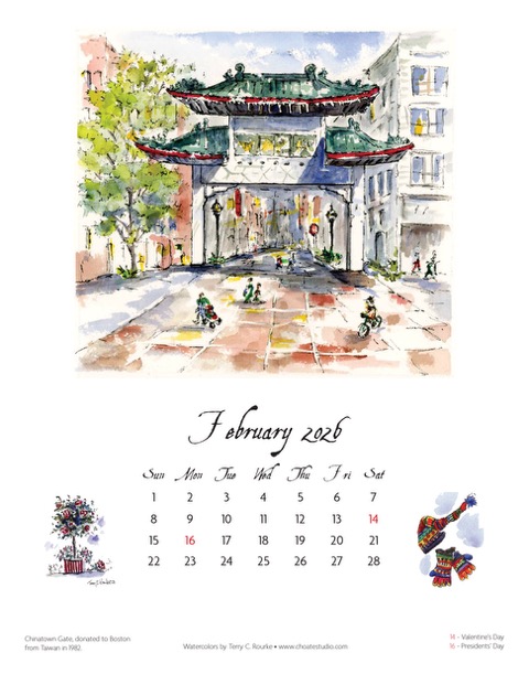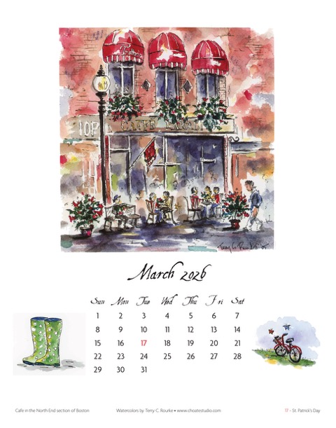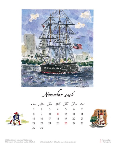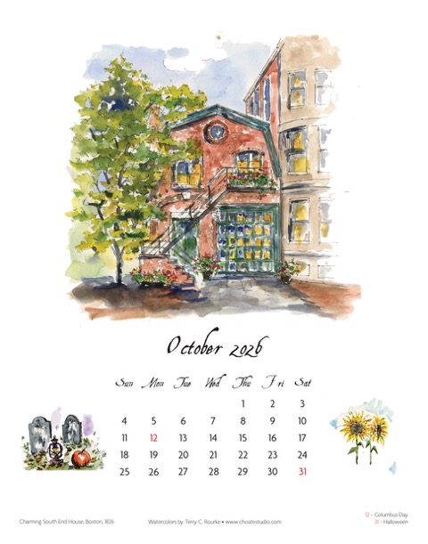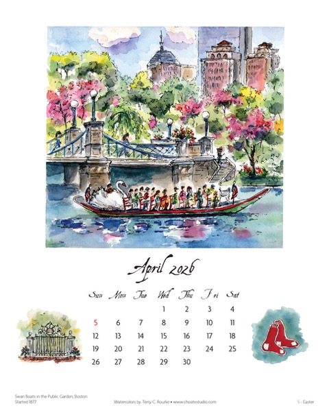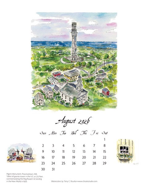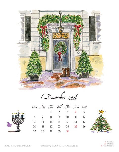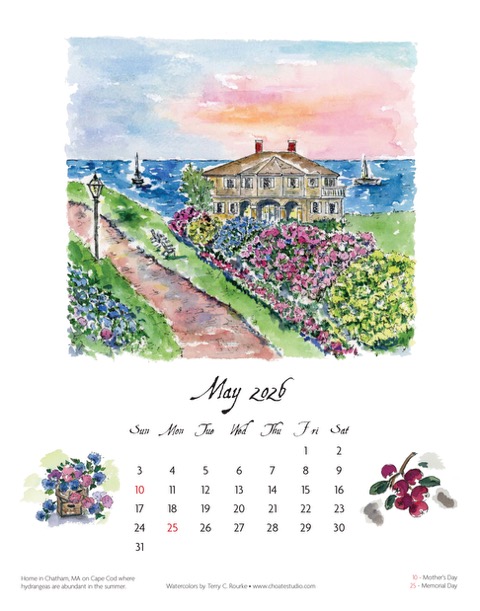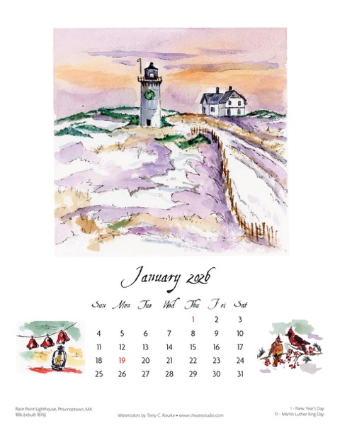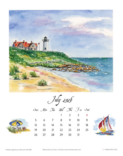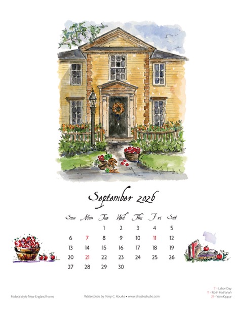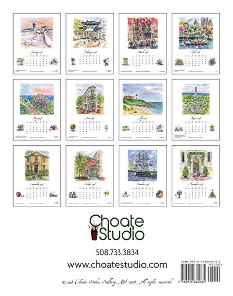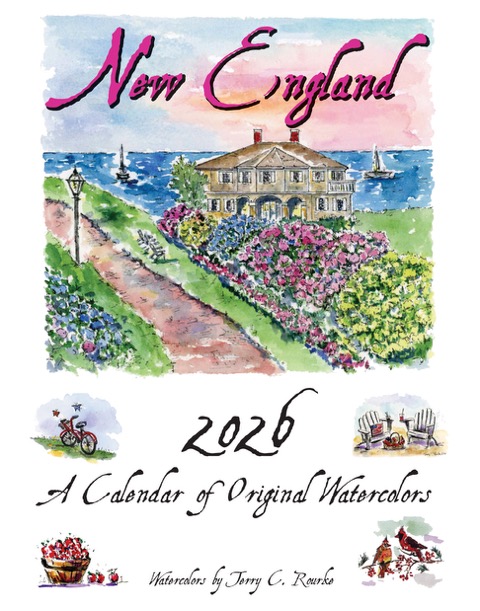 The 2026 monthly watercolor calendar contains 12 renderings of beautiful New England.